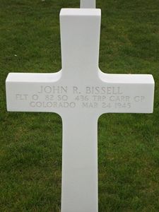 F/O John R. Bissell joined the Air Corps of the U.S. Army Reserve in Seattle, Washington on 9 July 1942. He attended college for 1 year and worked as a yard landscaper and was married.F/O John R. Bissell was KIA after he landed his glider on landing zone S during Operation Varsity.