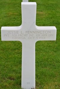 Pvt Jessie L. Pennington had been employed by Pacolet Manufacturing Co. before he enlisted at Fort McPherson in Atlanta, Georgia, on 21 September 1943.Source of information: Terry Hirsch, www.wwiimemorial.com, www.ww2-airborne.us, www.archives.gov, 1940 Census, WWII Draft Cards
