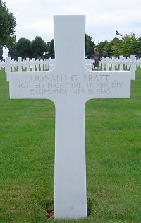 Sgt Donald G. Pratt lived in Villa Park, Illinois. His family moved to Los Angeles in 1939 and Don followed at a later date. He enlisted on 20 February 1942 at Ft. MacArthur in San Pedro, California. Boot camp was at Camp Pendleton.He died during a parachute jump near Kamp Lintfort in Germany.