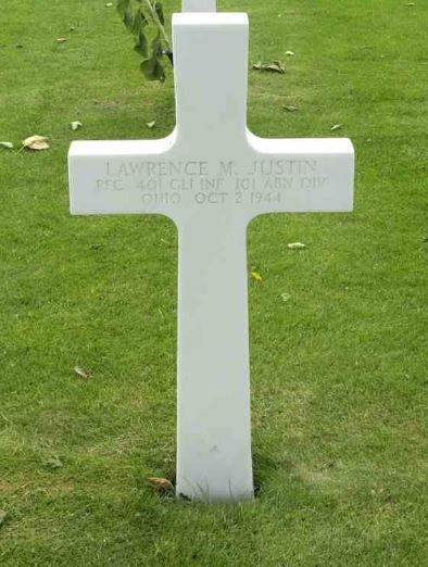 Pfc Lawrence M. Justin graduated from Elyria High School in 1936 and was employed by the Steel and Tubes division of the Republic Steel Corporation for six years before he enlisted in Cleveland, Ohio on 10 August 1943.He was first buried at the Temporary American Military Cemetery of Molenhoek, The Netherlands.