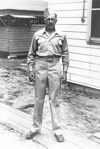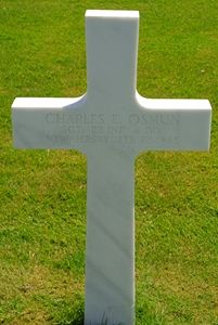 Sgt Osmun married Ellen L. Depaolo in 1942. He enlisted at Fort Dix, New Jersey on 25 March 1944.Sgt Osmun was killed in the woods, surrounding the town of Dausfeld. His remains stayed unrecovered until a local citizen, Miss. Weiskopf accompanied an investigation team to the exact spot near a deep trench where she and her sister had seen two dead US soldiers in april 1945. Upon looking into the trench, investigator Sgt John smith, noticed that a part of the trench had been filled op in this particular area and upon probing a both ends of the elevation in the trench, the typical soles of US Army combat shoes became visible. Immediately, disinterring operations were commenced and the complete skeletal remains of two US soldiers were recovered. On the them was Charles Osmun. His remains could be identified by means of identification tags and a golden ring bearing the initials CO.