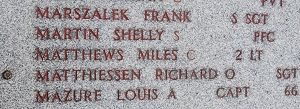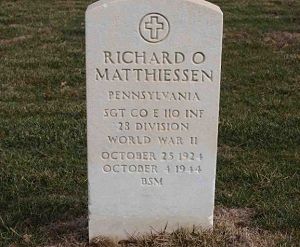 Sgt Richard O. Matthiessen graduated from South Philadelphia High School in 1942.The remains of Sgt Matthiessen were recovered in 1960 by German workers laying a pipeline near the Belgian border. Until that time, he had been listed as missing in action after taking part in an assault on a German pillbox near Oudler, Belgium in October 1944.