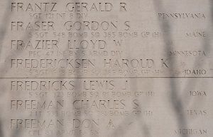 S/Sgt Harold K. Fredericksen worked on a farm before he enlisted in Spokane, Washington, on 23 November 1943.The airplane collided with B-17 #43-38639. It broke in two. The front half continued a loop and went over the top of the other aircraft. The remainder of the aircraft adhered to the other airplane. The front portion crashed into the North Sea and no parachutes were seen. The remainder crashed with the other aircraft.