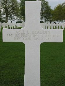 Pfc Abel L. Beaudin enlisted in Utica, New York on 21 January 1944.During basic training at Camp Blanding, Floriada, he sustained severe burns in an accident and was treated in an army hospital for four months. He later volunteered for paratrooper, received his training at Fort Benning, Georgia and earned his wings in November 1944. He was sent overseas in February 1945.