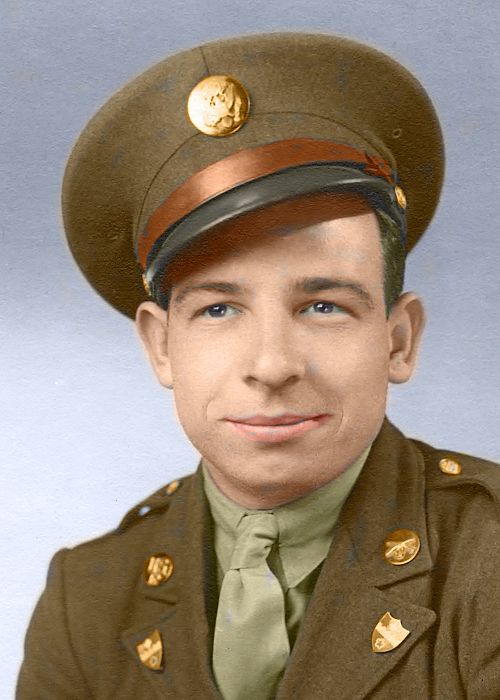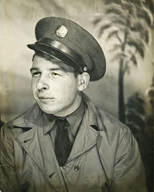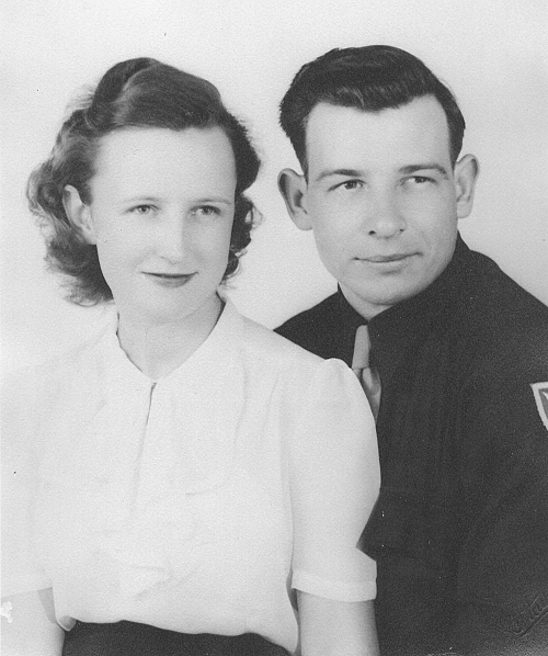 At an early age, Tommy worked for a time as a machinist with Packard Motor Company in Detroit, Michigan, before moving to California. In California he was with the C.C.C. (Civilian Conservation Corps) before joining the Army. He joined the Army 28 January 1941 at Fort McArthur, California. He was sent to Camp Swift, Texas (near Elgin) in June 1941 and was with the 95th Division, 379th Infantry. He had joined for a one year tour of duty, but when Japan bombed Pearl Harbor 7 December 1941, he was not allowed to be discharged and had to remain on active duty.On 28 November 1942, he married Muriel Wiley at Camp Swift. At that time, he was a Sergeant (Mess Sergeant, meaning a cook). He was later promoted to Staff Sergeant. Because of the escalating war, his group was sent to Louisiana for (once again) basic training. Because of some problem, he lost his rank and became a Private First Class. His group was sent to Fort Leonard Wood, near Waynesville, Missouri. Muriel was there with him for several months until his group was ordered overseas. Because he had astigmatism in his eyes, he had glasses prescribed for him. While waiting for his glasses, his group was sent overseas and he became part of another group, First Army, 4th Division, 8th Infantry, Company M.