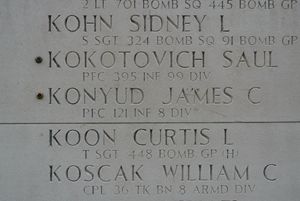 In 2007, a German explosive team found human remains and military equipment in a field between Vossenack and Hürtgen which included a set of Pfc Konyud's identification tags. His remains were identified on 24 August 2009.