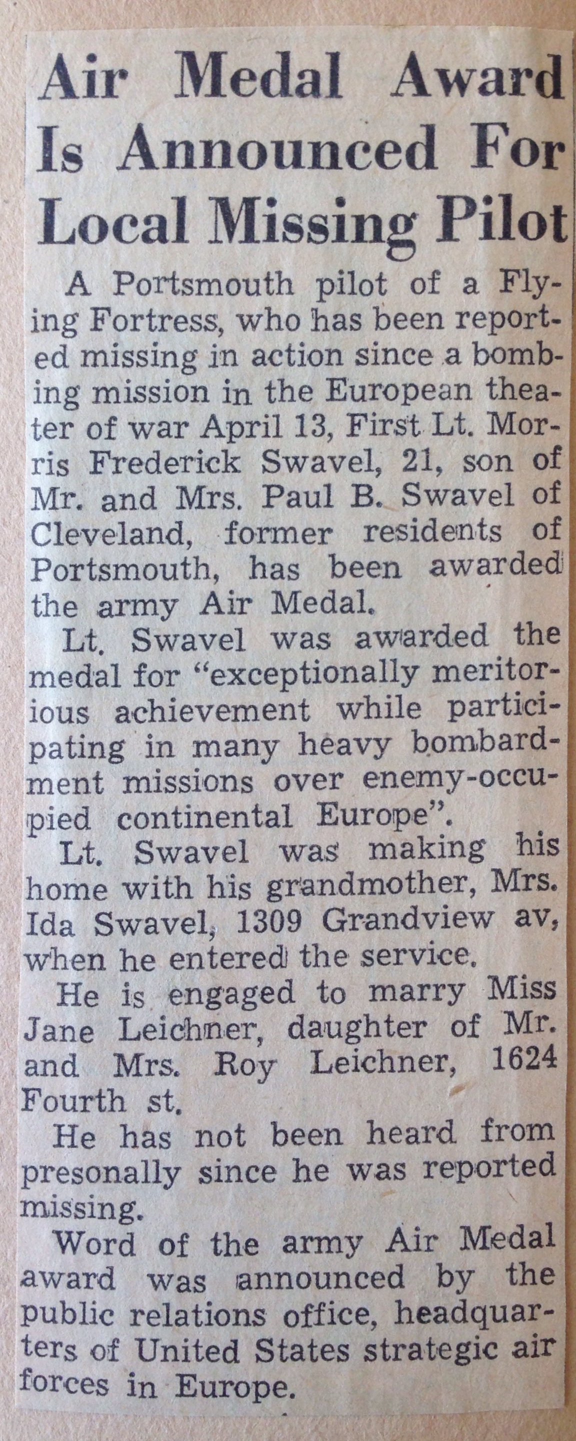 1st Lt Morris F. Swavel attended college and was a clerk before he volunteered for the Air Corps of the Army of the Unites States at Patterson Field, Fairfield, Ohio, on 13 April 1942.He was awarded his wings and commission at Altus Army Airfield, Oklahoma in April 1943 and was sent overseas in January 1944. He was promoted to first lieutenant in England in the spring of 1944, about a month before he was reported missing.
