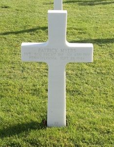 Patrick Myers was first buried at the Temporary American Military Cemetery of Son, The Netherlands.Source of information: Astrid van Erp, www.wwiimemorial.com, www.ancestry.com - Headstone and Interment Record / 1930 Census, www.ww2-airborne.us
