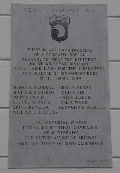 In St. Oedenrode a plaque can be found with the names of the paratroopers of B Company 502nd Parachute Infantry Regiment, 101st Airborne Division who gave their lives for the liberation and defense of St. Oedenrode in September 1944.