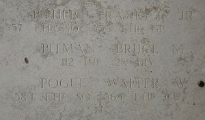 Bruce M. Pitman enlisted on 12 February 1942 at Camp Grant, Illinois.When his platoon had no more remaining officers, he took over command and noticed one of his men missing. He went to look for him and did not return. The platoon guide, Sgt Roy Littlehales, set out to find him and located him about 25 yards away with his left leg torn off from the knee down, the victim of an artillery explosion. Sgt Littlehales screamed for a medic, who said there was nothing he could do but give him a shot of morphine. He died later that day. He was up for a commission at the time of his death.