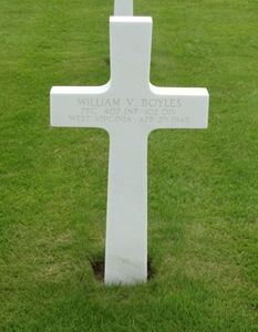 Pfc William V. Boyles graduated from Parson High School with the class of 1943. He was employed at Newport News, Virginia before he enlisted on 1 September 1944. He trained at Camp Atterbury, Indiana, Fort McClellan, Alabama, and Camp Meade, Maryland. He was sent overseas on 3 January 1945.Source of information: Peter Schouteten, Terry Hirsch, www.wwiimemorial.com, www.archives.gov, www.ancestry.com -