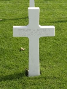 S/Sgt Richard W. Boeglin enlisted in Providence, Rhode Island on 29 September 1943.He was awarded the Silver Star Medal posthumously for an action on 7 April 1945. The citation stated: "For galantry in action at Dorna, Germany, on 7 April 1945. When forced to withdraw from outpost positions as a result of enemy attack, Sergeant Boeglin, a light machine-gun section leader, saw that his men lacked time to prepare adequate defenses. Without regard to his own life, Sergeant Boeglin left his protected position and, singlehandedly, engaged the enemy in a duel of fire. By diverting the enemy in this matter, his men were afforded the necessary time to fortify their positions and continue a rear guard action. During the operation Sergeant Boeglin was mortally wounded. His outstanding valor and courageous leadership reflect the higest credit upon Sergeant Boeglin and the military service."