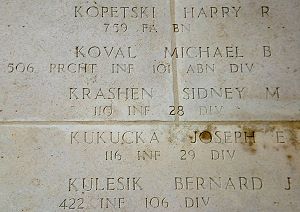 Pvt Sidney M. Krashen was taken prisoner of war on 28 November 1944 when his unit was located in the vicinity of Consthum, Luxembourg.He was killed during an Allied air raid on the city of Halle, Germany. The raid was very big and most of the city was demolished, resulting in more than 20,000 casualties. For weeks the dead were taken out of the buildings and buried in wooden boxes without any regard to nationality. Investigation after the war couldn't locate his grave.