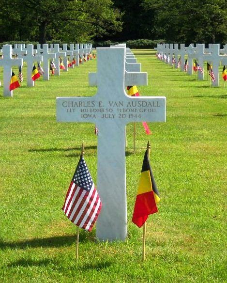 1st Lt Van Ausdall was found with a fractured skull and his left foot missing and taken to the Reserve Hospital for POW's in Hohenstein-Ernstthal where he died the same day. He was initially buried at the Genesungsheim Cemetery at Bethlemstift, Hohenstein-Ernstthal, together with the other three killed crew members on 22 July 1944.