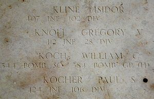Sgt Knoll’s name is recorded on the Tablets of the Missing at Henri-Chapelle American Cemetery. A rosette was placed next to his name to indicate he has been accounted for.
