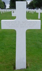 Sgt Chester D. Wonderly enlisted at Fort Leavenworth, Kansas on 10 April 1943.On 24 March 1945, F/O Warren R. Miller was flying Glider No. 45-6097 (position 99) and I, James W. Bartelse, was flying Glider No. 42-43004 (position 100). The mission was a double tow pulling Warren R. Miller and myself on the same tow. Because of smoke over the LZ, we overshot our cut off point. When Glider no. 45-6097 finally cut off I followed him in on what seemed to be a 180 degree approach. When I last looked ahead I saw flak hit his right elevator. Just after I last saw him I pulled my tail chute and we dropped below him. I assumed he kept the same heading and landed further down. The last time I saw him he was 300 feet in the air and slightly ahead of me. I didn´t see him land and can´t say he crashed.