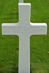 1st Lt Richard C. Mervyn has been the Pilot of a C-47A that flew wounded troops, in the rear of the aircraft, back from the front to hospitals, when it went down on 14 April 1945. Presumably all aboard the aircraft were killed in wheather conditions of Zero – Zero.His brother 1st Lt Robert D. Mervyn is buried at Plot G, Row 10, Grave 22.