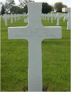 Pvt Jay A. Young graduated from Selingsgrove High School in 1929 and was a retail manager at the Weis supermarket in Selinsgrove.He enlisted in New Cumberland, Pennsylvania on 27 March 1944 and was detailed to Camp Blanding, Florida. His storekeeper ability won him quick advancement to the rank of Supply Sergeant. He was assigned to Fort George Meade and then embarked overseas, landing in France in September 1944. A surplus of Supply Sergeants resulted in his reduction to the rank of private and transfer to the infantry.