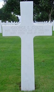 Pvt George E. Colts attended Lincoln Junior High School and was employed by the Watson Manufacturing Company. He enlisted at Fort Dix, New Jersey on 3 May 1944.Pvt George E. Colts was aboard a C47 in the lead Serial A-1, 438th TCG. It was scheduled to drop the paratroopers on Drop Zone W. The pilot lost its way in the smokescreen, which led to the 1st Battalion being dropped in the vicinity of Diersfordt. After landing safely, his company advanced towards the west side of Wesel, where he was killed.