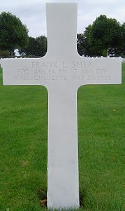 Pfc Frank L. Shea Jr. joined the National Guard in Boston, Massachusetts on 16 January 1941.Source of information: Raf Dyckmans, Terry Hirsch, www.abmc,gov, www.ancestry.com - 1920/1930 Census / U.S. WWII Draft Cards Young Men / WWII Enlistment Record / Headstone and Interment Record
