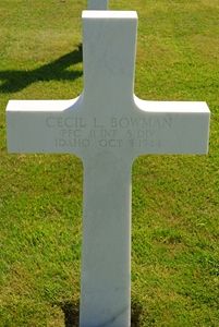 Pfc Cecil L. Bowman worked as an operator at a service station in Downey, Idaho before he enlisted in Tacoma, Pierce County, Washington on 8 February 1943.Source of information: Peter Schouteten, www.wwiimemorial.com, www.ancestry.com - 1920/1940 Census / WWII Enlistment Records / Lyla Curtis Walsh Sepulveda-Hernandez two Family Tree / U.S., Headstone and Interment Records for U.S. Military Cemeteries on Foreign Soil, The Fifth Infantry Division in the ETO, 1945, ISBN: 0-89839-274-8, www.archives.gov